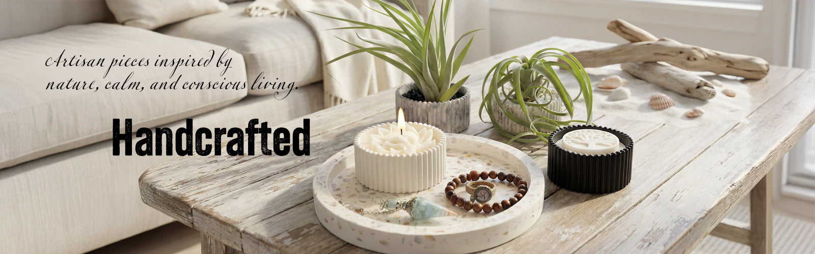 Each handcrafted piece is thoughtfully made in small batches, blending natural textures, calming forms, and quiet ritual into functional design. From sculptural vessels and trinket holders to softly glowing candles, every piece is shaped, poured, and finished by hand with care and intention. Subtle variations make each creation feel personal and alive, honoring the beauty of slow, mindful making. These pieces are created to support moments of reflection, rest, grounding, and gentle presence throughout your everyday rituals.