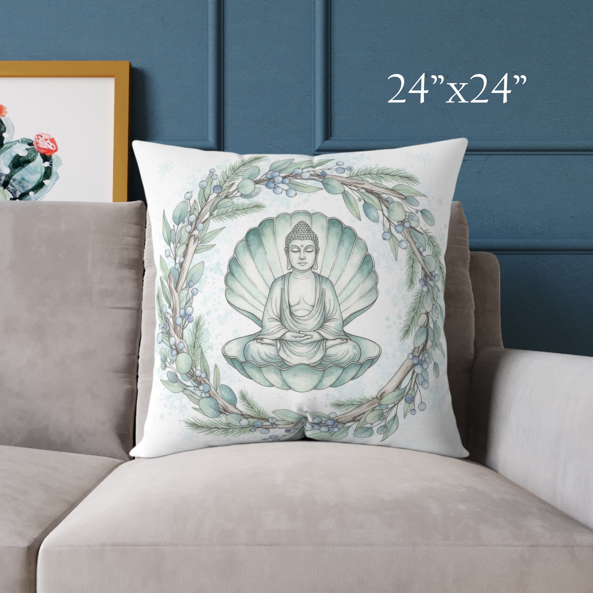 A serene Buddha rests within a seashell, framed by soft coastal botanicals and gentle winter tones. Like a moment of stillness tucked away from the noise of the world. With subtle detailing and watercolor textures, this pillow adds a grounding energy into any space, making it ideal for meditation corners, reading chairs, bedrooms, or anywhere you want to cultivate a sense of calm and mindfulness. The coastal elements keep the design airy and light, allowing it to blend beautifully with both neutral and layered interiors.